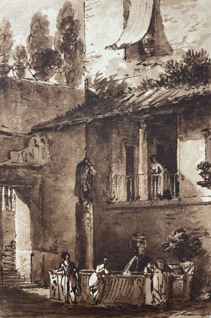 Figures by a well within a courtyard